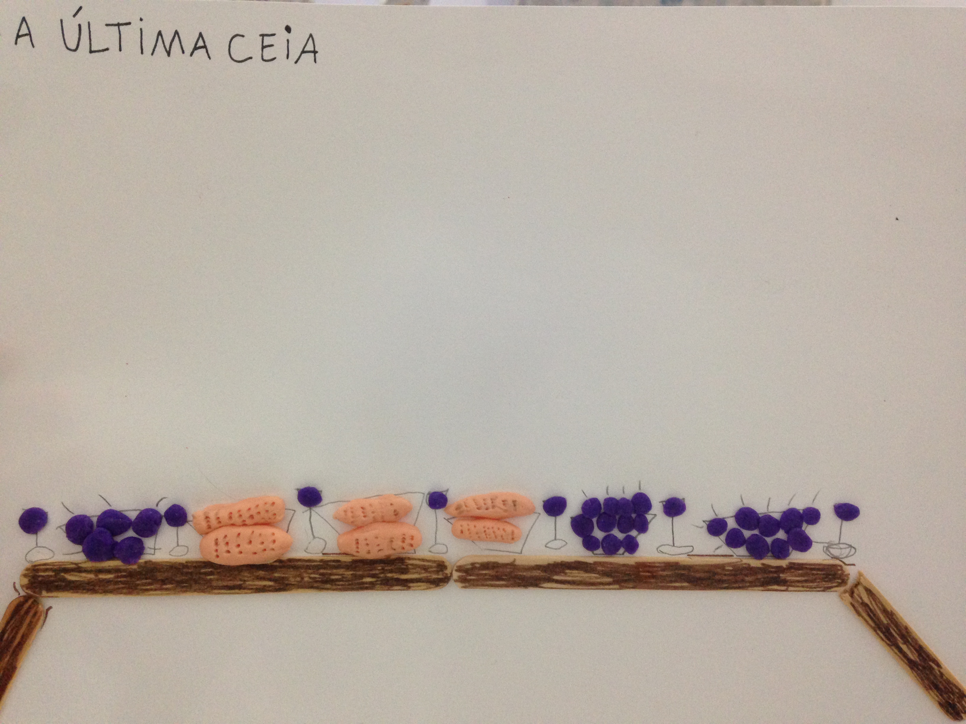 Como atividade, você pode falar para as crianças desenharem a mesa da ceia de Jesus utilizando palitos de picolé e biscuit roxo e amarelo para modelar as uvas e o pão, depois cole tudo com cola líquida em uma folha.